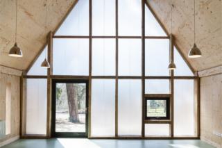 The scheme also features polycarbonate cladding similar to that which Taylor used on the Big Shed at Hooke Park. On the mess building this forms the scheme’s end wall, letting diffuse light flood into the main space, while on the larger shed-like building it is also used to bring in light and break up the large elevation.
