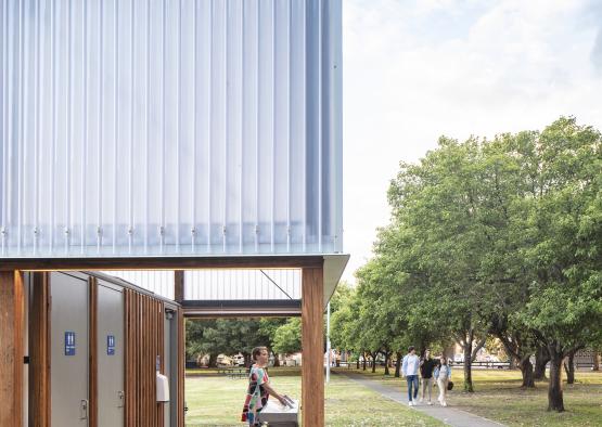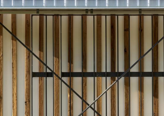 The previous life of the recycled timber can be seen in its imperfections, which add character to a building designed for very utilitarian use. This subtle use of material character brings the structure to life.