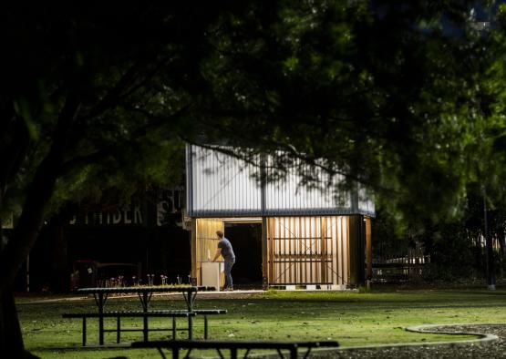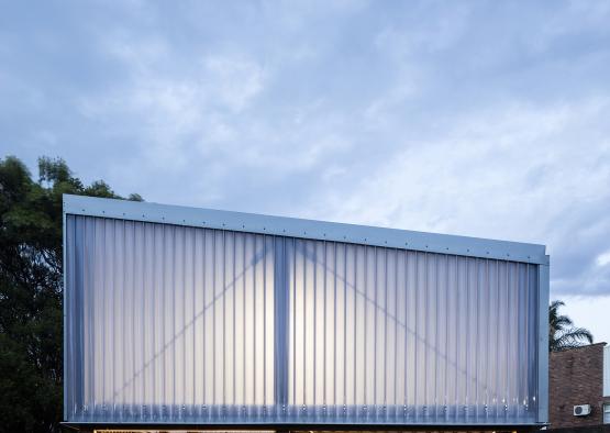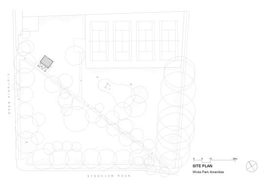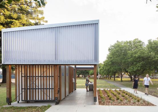 Impact resistant polycarbonate panels form the upper walls and roof, giving the little building a lantern like quality. The base is solid and private where required, and open and transparent elsewhere to maximise visibility, and airflow. The location was previously dark at night, so passive surveillance and lighting were a key aspect of the design.