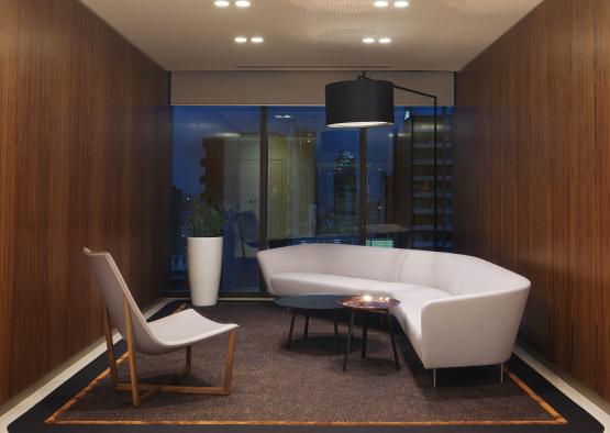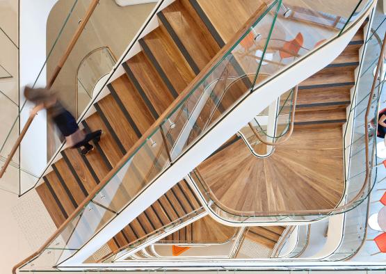 Timber links seven floors of workspace and executive spaces, conveying company values through the dynamic and versatile use of American Walnut.