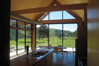 The house is made almost entirely of timber. Glulam pine portals at 4 m centres provide the core structure, with double-glazed windows and macrocarpa boards on pine framing.
