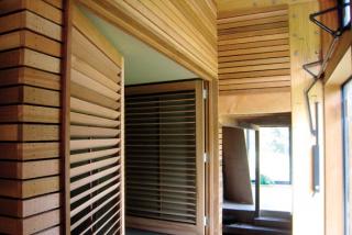 Everything inside is arranged around the bathroom, which sits in the middle of the plan and helps support the mezzanine bedroom. In contrast with the exterior walls, this is clad in finer textured, dressed cedar slats.