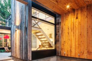 Using reclaimed oak siding was one of several strategies implemented to achieve a subtle integration into the historic streetscape. Most of the siding was installed horizontally, although in some areas the wood was planed to remove the weathered finish and installed vertically. This change in texture highlights the form of the house.