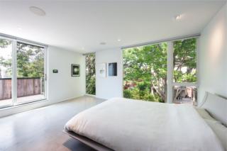 The overall size and placement on the narrow block was carefully considered to avoid overwhelming the streetscape. While definitely modern in design, the use of reclaimed white oak on the exterior, a recessed carport and the landscaped green space at the front and side courtyard ensure the environmentally friendly home complements and enlivens the neighbourhood.