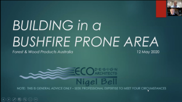 In this webinar Nigel Bell (ECOdesign Architects) discusses the extra construction costs, the key regulations, the process that determines construction materials, AS 3959 design and construction requirements, bushfire bunkers, bushfire sprinklers and more.